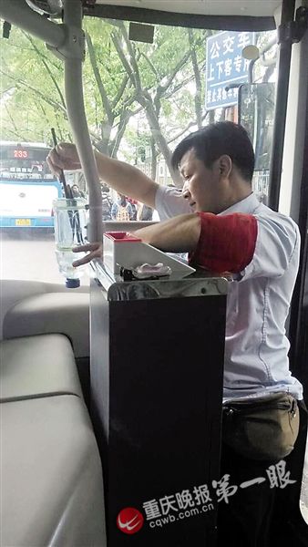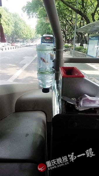重慶晚報(bào)記者從前門上車,一眼就看見(jiàn)門柱上綁一個(gè)小號(hào)飲料瓶,票箱旁綁著一個(gè)大號(hào)飲料瓶,瓶子被白色扎帶和膠皮管牢牢系住,瓶口向下,瓶子底部被剪開(kāi)朝上。大號(hào)瓶里有兩條小金魚(yú),正歡快地游著。