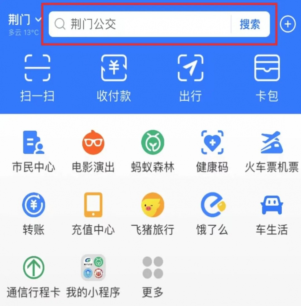 01 打開(kāi)“支付寶APP”,首頁(yè)搜【荊門公交】