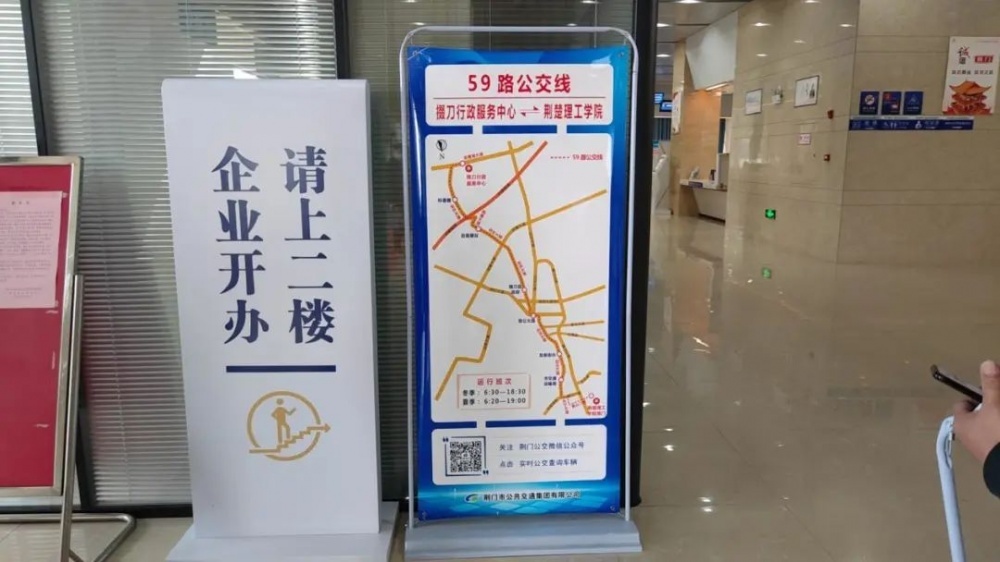荊門高新區(qū)·掇刀區(qū)政務服務中心大廳內59路車走向信息展牌引導乘車