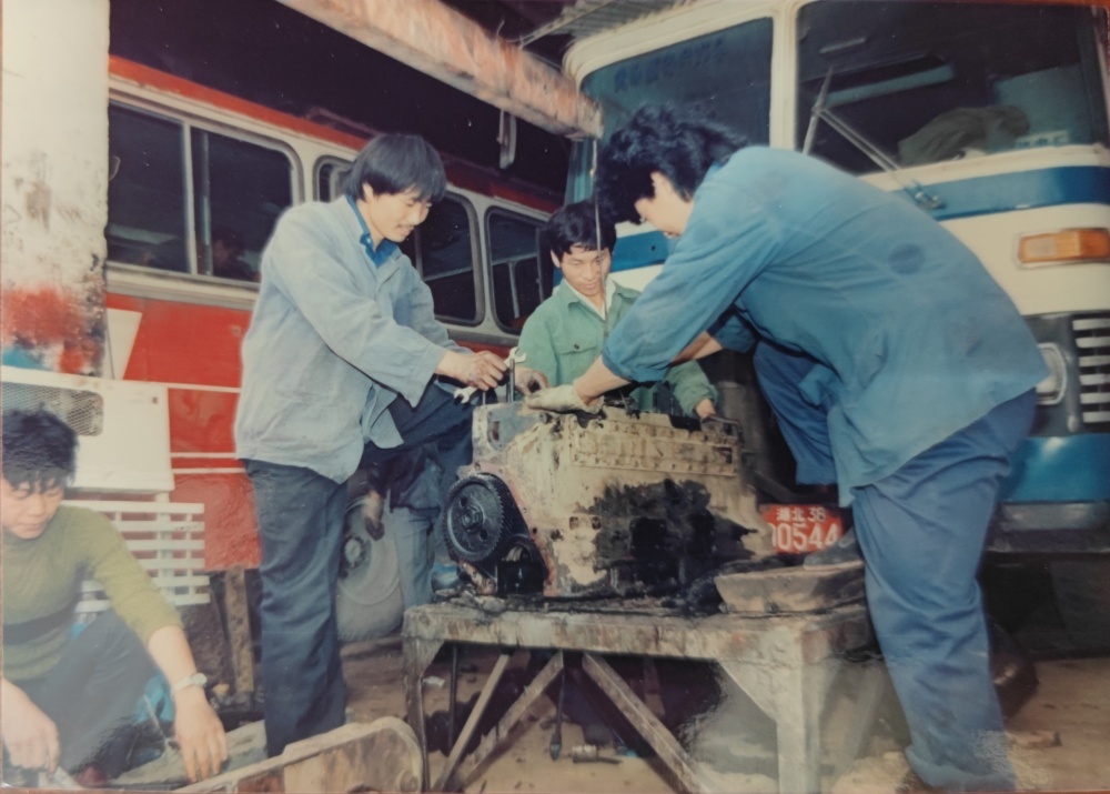 ▲80年代,車(chē)間修理工檢修模樣。3個(gè)機(jī)修工一同修理著車(chē)輛發(fā)動(dòng)機(jī),臉上沒(méi)有吃力感,更像是帶著興趣在專研。