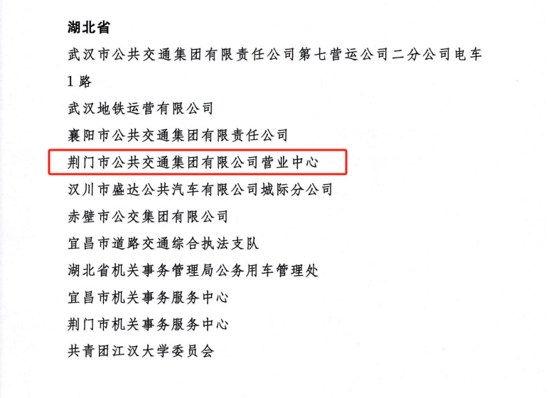 近日,交通運(yùn)輸部、公安部、國(guó)家機(jī)關(guān)事務(wù)管理局、中華全國(guó)總工會(huì)、共青團(tuán)中央聯(lián)合發(fā)出《關(guān)于表?yè)P(yáng)2023年綠色出行宣傳月和公交出行宣傳周活動(dòng)成績(jī)突出集體和個(gè)人的通報(bào)》。其中,荊門(mén)市公共交通集團(tuán)有限公司營(yíng)業(yè)中心被評(píng)為活動(dòng)成績(jī)突出集體,荊門(mén)市公共交通集團(tuán)有限公司羅莎被評(píng)為活動(dòng)成績(jī)突出個(gè)人。
