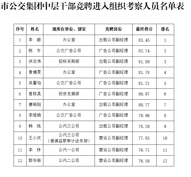 根據(jù)市公交集團(tuán)中層干部競聘工作要求,共有12名競聘者(最終得分前12名)進(jìn)入組織考察環(huán)節(jié),現(xiàn)將人員名單公示如下(見附件)。