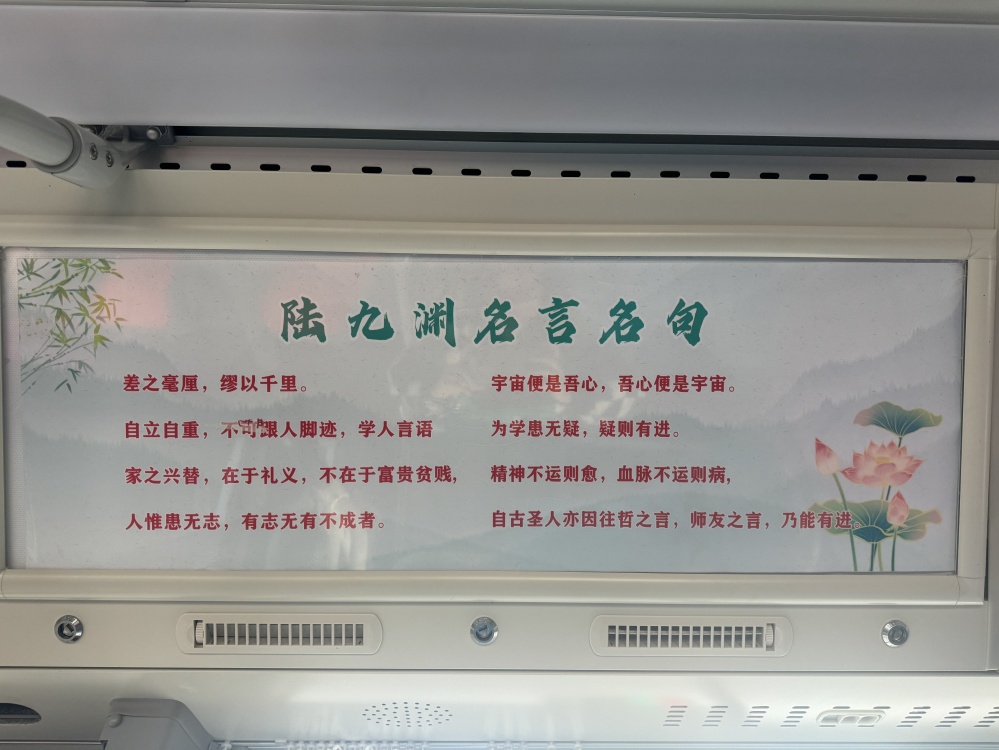 “陸九淵號(hào)”不僅僅是一條公交線路,更是一個(gè)移動(dòng)文化陣地。當(dāng)你踏上這趟公交車,你會(huì)被駕駛員的熱情服務(wù)所感染,他們微笑著迎接每一位乘客,以優(yōu)質(zhì)的服務(wù)彰顯著荊門的文化精神和城市溫度。車輛全部采用新能源公交車,不僅環(huán)保節(jié)能,行駛起來也更為平穩(wěn),同時(shí),在車輛內(nèi)外裝飾以及“進(jìn)站、出站、溫馨提示”等場(chǎng)景語音播報(bào)融入陸九淵相關(guān)元素,讓乘客潛移默化的加深對(duì)荊門文化的認(rèn)識(shí)和理解。