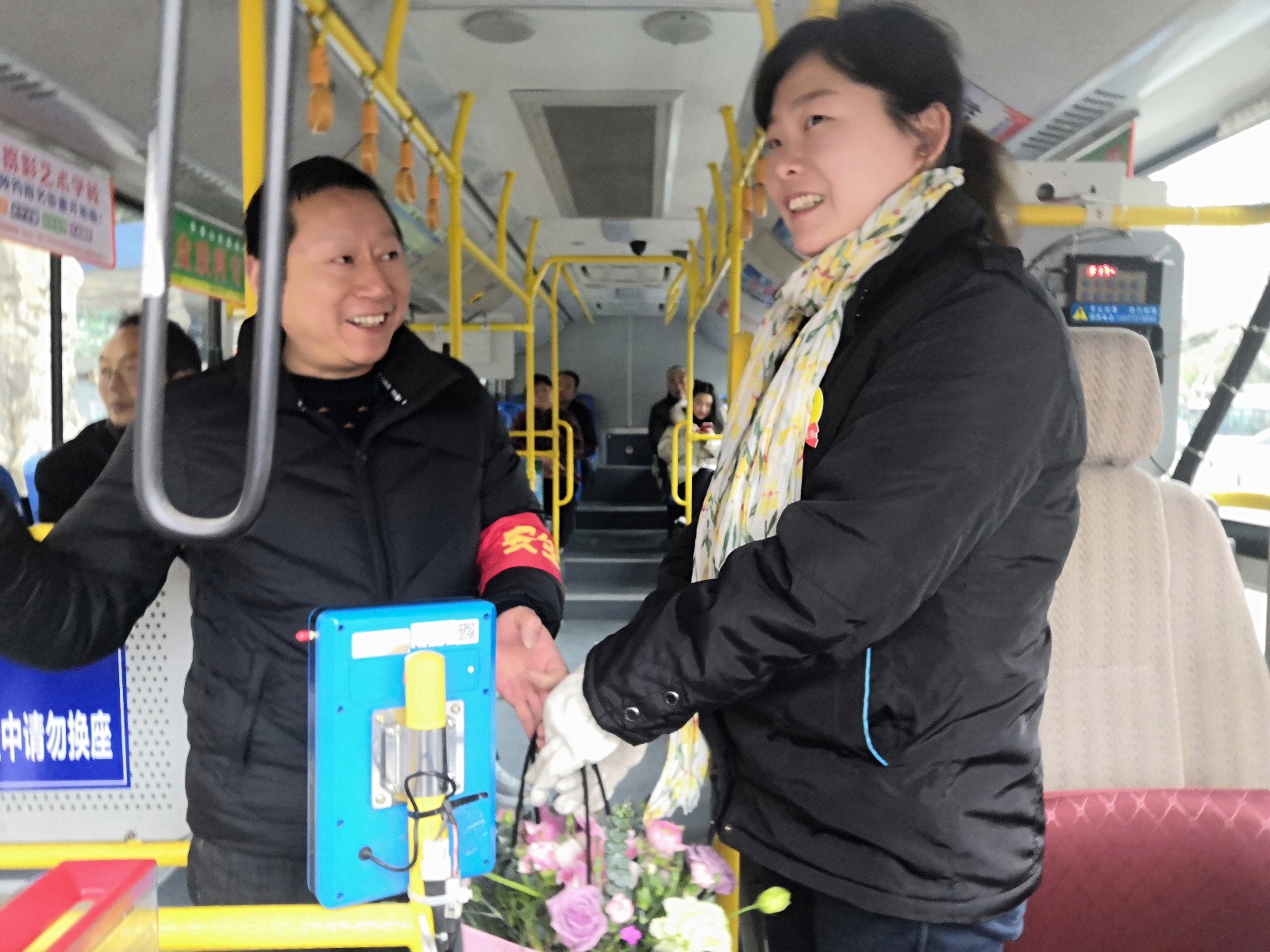 “我代表公司全體男職工,祝你們節(jié)日快樂,永遠(yuǎn)美麗??!這籃鮮花送給你~”公交信息技術(shù)部男職工羅皓這樣說道,并將一籃鮮花送到正在跑班的公交女駕駛員蘇純菊手中。面對這突來的鮮花和祝福,蘇純菊滿臉驚喜和溫馨,“謝謝,謝謝你們”在道謝聲中,關(guān)上車門,微笑著駛向下一站。
