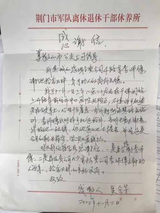 11月6日上午9時(shí),公汽三公司收到由調(diào)度中心代收的一封感謝信,信中寫到“我真誠(chéng)的感謝貴公司4路車?yán)顜煾?,謝他拾金不昧。樂(lè)于助人的高尚品德”。